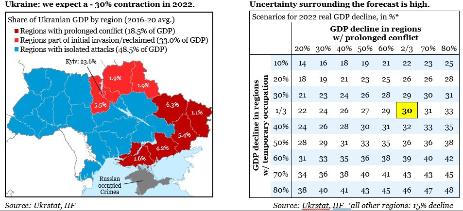 We expect Ukraine’s GDP to contract by 30% in 2022. We also present scenarios based on assumptions: regions with isolated attacks (-15%), regions that were part of the initial invasion but have been reclaimed (y-axis), regions with prolonged war (x-axis)